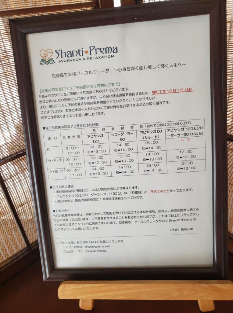 いつもアーユルヴェーダサロンShanti♡Premaをごりよういただき、誠にありがとうございます。急なご案内となり恐縮ではございますが、より良い施術環境を維持するため、令和7年12月1日(月)より、曜日により営業時間および最終受付時間を調整させていただくことになりました。