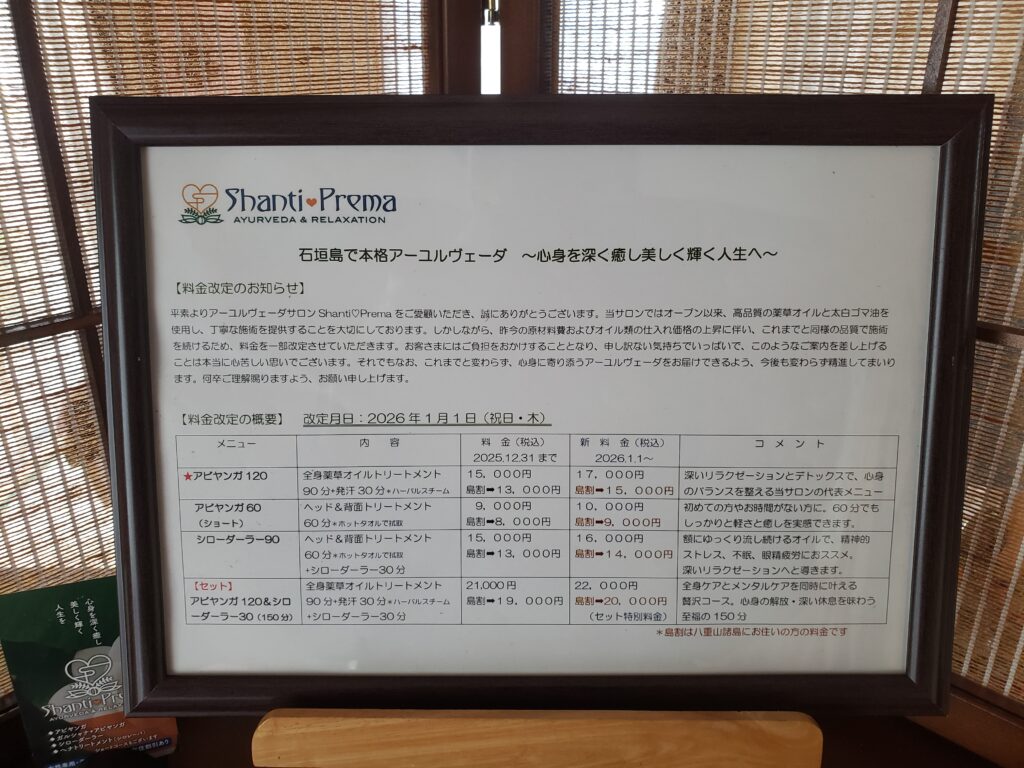 いつもアーユルヴェーダサロンサロンShanti♡Premaをご利用いただき、誠にありがとうございます。当サロンでは、オープン以来、高品質の薬草オイルを使用しております。そのような中、昨今の物価高騰で、使用している薬草オイルやサロン運営にかかる諸経費の値上がりも同様です。今後も、サロンの安定したサービスを提供するために一部のメニューを2026年1月1日(祝日・木)より料金改定させていただきます。これからも、お一人おひとりに寄り添い質の高い施術をご提供し続けてまいります。何卒ご理解賜りますようお願い申し上げます。